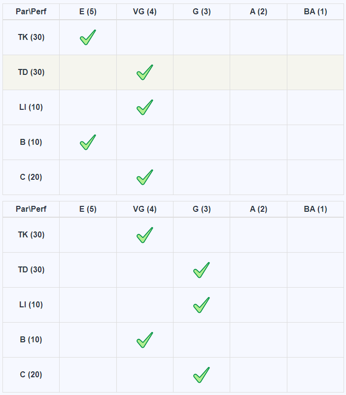 <th>: We have used<th>tag to define the column headers for the table, which are "Par\Perf", "E (5)", "VG (4)", "G (3)", "A (2)", and "BA (1)".We have used class attribute to apply CSS to the cells.