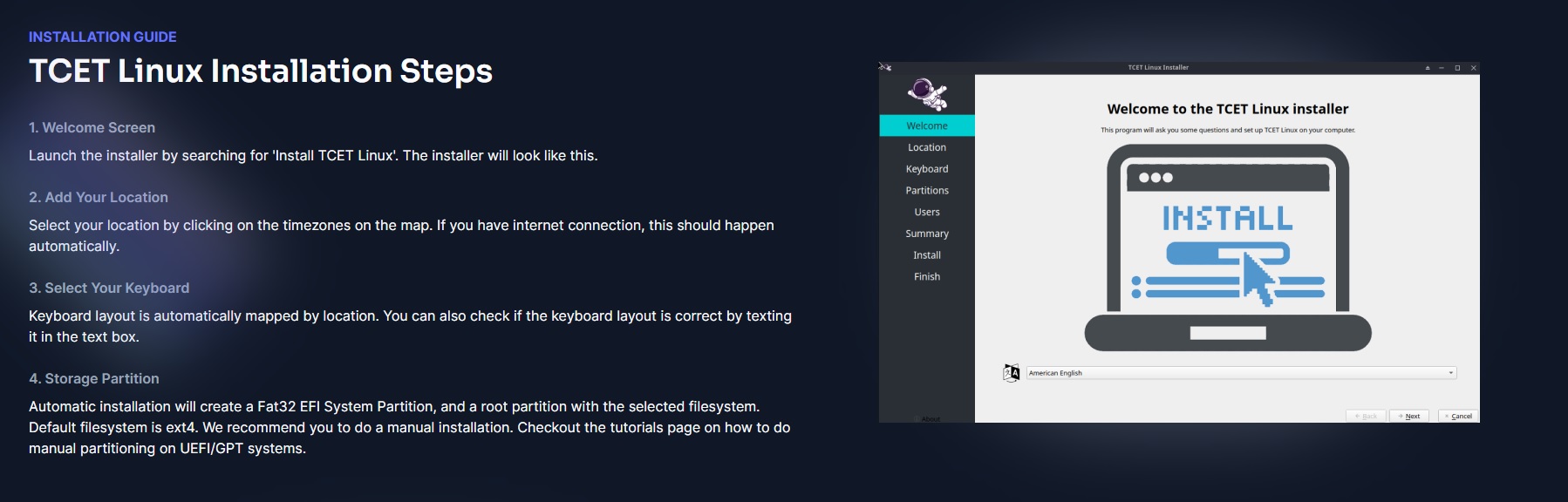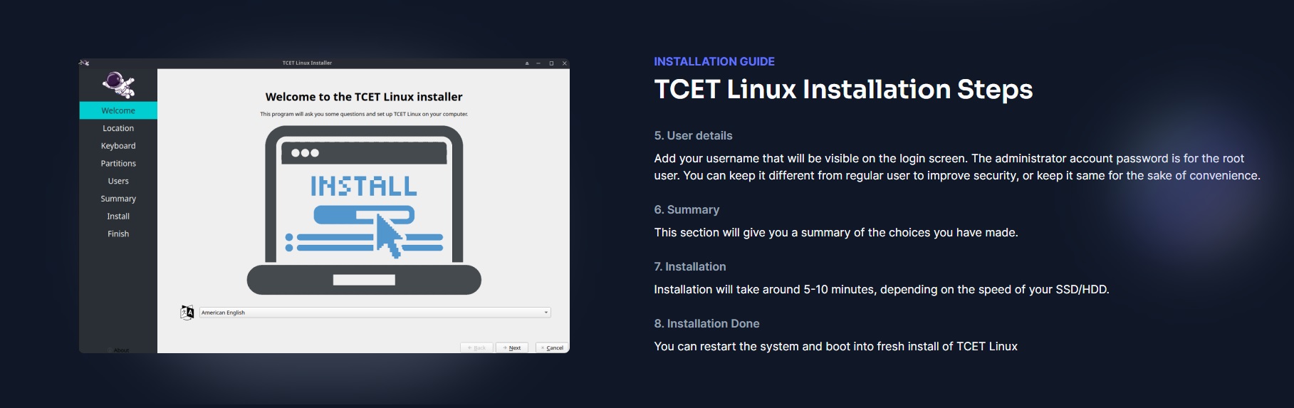 TCET Linux Installation Steps element is a step-by-step guide created by us that will walk you through the process of installing TCET Linux on your system. We have included all the neccessary steps from Initial Welcome Screen to selecting your Location, Keyboard Layout, Storage Partitioning, and User Details. This Section in the TCET Linux Website helps the user to easily install TCET Linux on their Device.