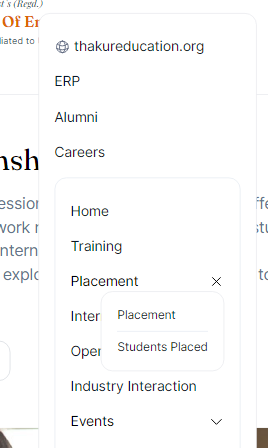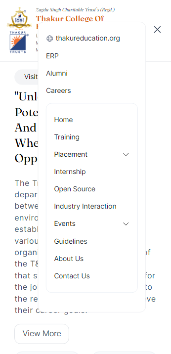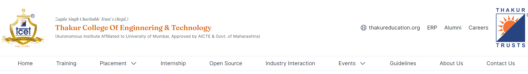 The Header section is an informative element which is present at the top of every page of the website. With its navigational features, it facilitates easy access to each and every page of the Training and Placement Website. It consists of TCET Logo, Thakur Educational Group Logo, Title & Description and a Menu presenting a list of links to different pages. Hence providing essential information and contributing to user-friendly experience.
