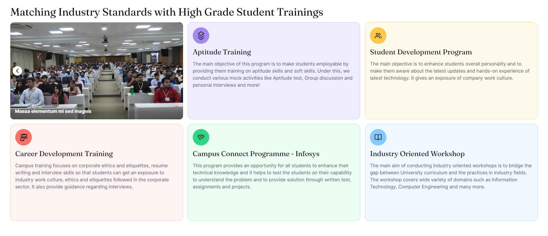 The Training page on our website showcases a variety of training activities conducted by Training and Placement Cell along with professional student bodies under the T&P department. It highlights the initiatives aimed at enhancing the skills and knowledge of students, preparing them for future careers. Additionally, the page features major events organized by these student bodies, providing valuable opportunities for networking and career development.